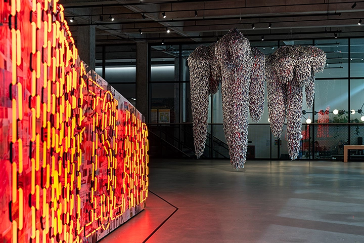 Ms. Watt’s deep commitment to community engagement was powerfully embodied in her 2023 installation, “Sky Dances Light.” Suspended from the ceiling, cloud-shaped forms shimmered with thousands of tin jingles, evoking the ceremonial regalia used in Native American jingle dances — traditionally performed as a healing offering. In a thoughtful break from conventional gallery norms, visitors were invited to touch the work, setting the jingles into motion and activating a soundscape of collective resonance and shared restoration.
