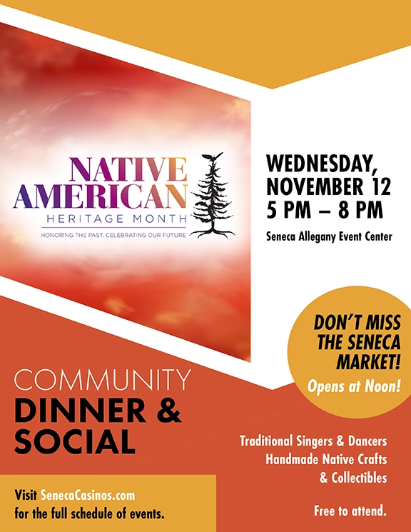 Native American Heritage Month is around the corner, and Seneca Gaming Corporation is seeking food vendors for the annual Community Dinner & Social on November 12, 2025. Interested vendors may submit for consideration to Nikki Seneca at NSeneca@senecacasinos.com by Friday, October 10. Questions? Call: 716-807-2704