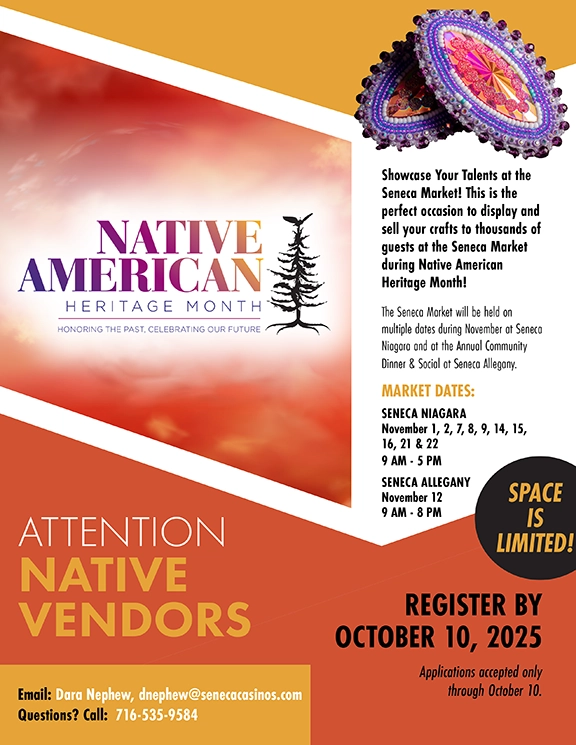 Call for vendors! Seneca Gaming Corporation is seeking vendors for their annual Seneca Market in celebration of Native American Heritage Month. Space is limited, so be sure to beat the deadline! To register, contact Dara Nephew at DNephew@SenecaCasinos.com or call (716) 945-9584.