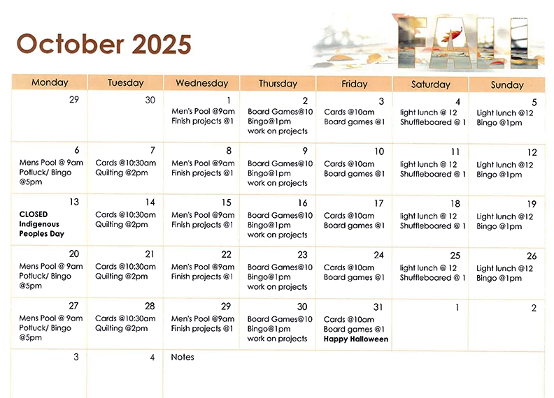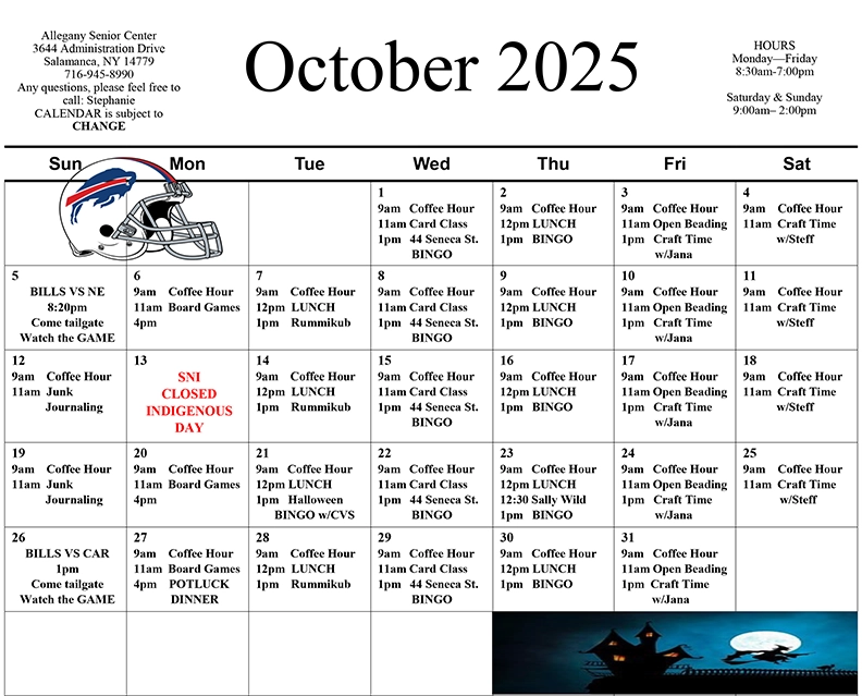Stop down to the Allegany Senior Center or the Wini Kettle Senior Center and enjoy daily activities throughout the month of October. For more information call Stephanie John at (716) 945-8990 (for Allegany) OR Brittany Seneca at (716) 532-5777, ext. 5501 for Cattaraugus.