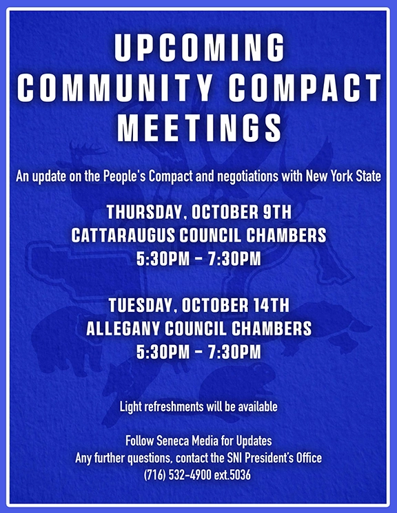 President J. Conrad Seneca and Seneca Nation Officials will provide an update on the People’s Compact, and negotiations with New York State on Thursday, October 9th, and Tuesday, October 14th.