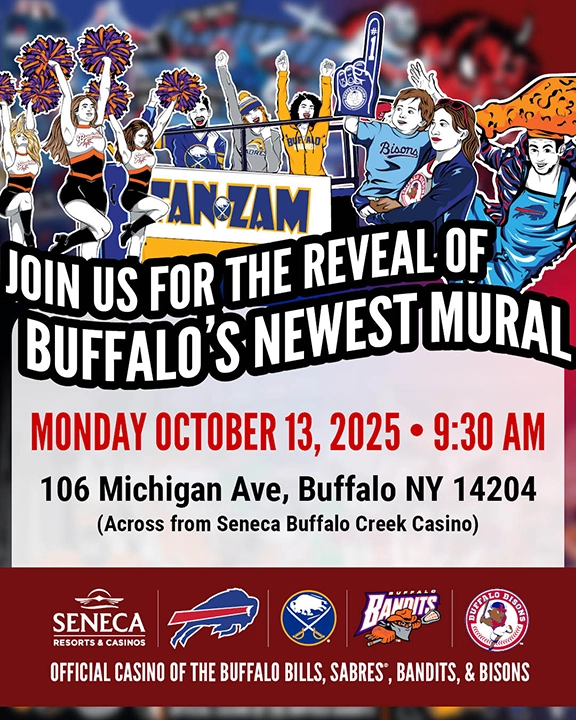 Company officials and team members will unveil an original mural that celebrates Western New York’s hometown professional sports teams and the players, personalities, fans and community that make every game an event. The public is invited to attend the unveiling ceremony on Monday, October 13 at 9:30 a.m. in the rear parking lot at 106 Michigan Ave., across from Seneca Buffalo Creek Casino.