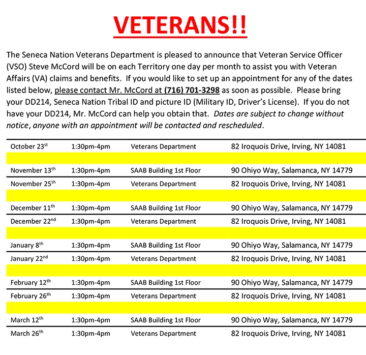 The Seneca Nation Veterans Department is pleased to announce that Veteran Service Officer (VSO) Steve McCord will be on each Territory one day per month to assist you with Veteran Affairs (VA) claims and benefits. If you would like to set up an appointment for any of the dates listed below, please contact Mr. McCord at (716) 701-3298 as soon as possible. Please bring your DD214, Seneca Nation Tribal ID and picture ID (Military ID, Driver’s License). If you do not have your DD214, Mr. McCord can help you obtain that. Dates are subject to change without notice, anyone with an appointment will be contacted and rescheduled.