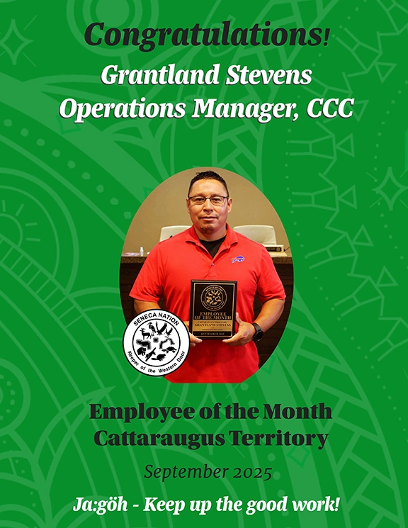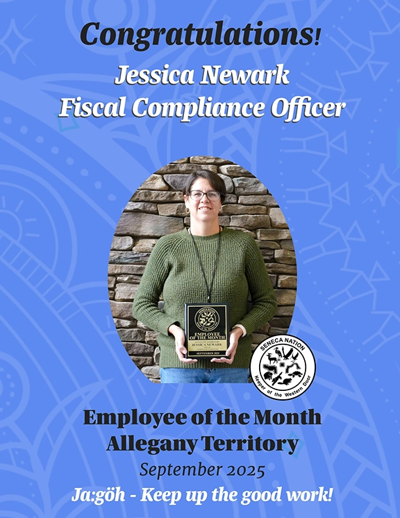 Congratulations to Grant Stevens, Operations Manager, Cattaraugus Community Center and Jessica Newark, Fiscal Compliance Officer who were named the September 2025 Employees of the Month during a special breakfast held in their honor. Each month, The Seneca Nation gathers to recognize a standout employee who demonstrates exemplary qualities in carrying out their daily assigned tasks. Grant and Jessica were chosen for their many years of dedicated service in challenging roles. Awardees enjoy a bonus day off, premiere parking, and a gift card of their choice. We’re all very proud of you!
