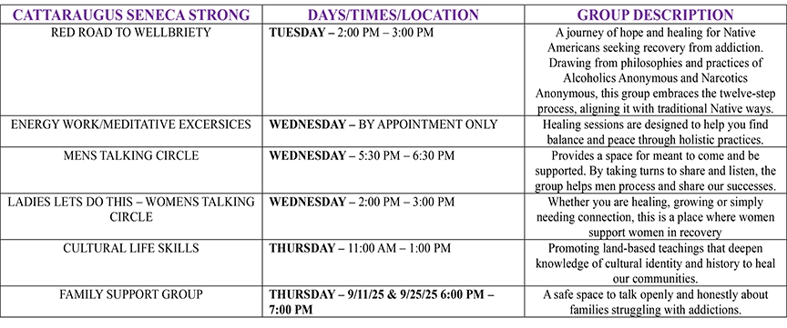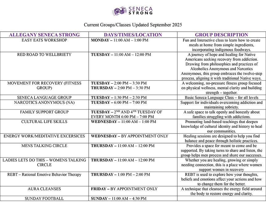 In August, all Seneca Strong staff completed Certified Recovery Peer Advocate training. This training is a 50-hour intensive training course and requires 500 supervised working hours, which teaches our peers to engage with individuals currently in a program or considering treatment, helping them develop recovery plans, effective coping habits, and life skills, staff were also trained on safety in the workplace, HIPPA, multiple treatment modalities, motivational interviewing, trauma informed care, and a cultural based recovery curriculum that emphasizes healing. Seneca Strong continues to expand their client base and support services by expanding staff and operating hours and implementing new groups and activities. Groups offered currently include family support groups, talking circles, cultural groups, arts/crafts activities, and holistic healing sessions (See attached group schedule).