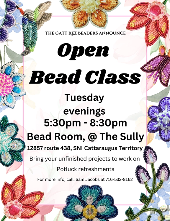 - Open Bead Class w/the Catt. Rez Beaders: Tuesday evenings from 5:30-8:30pm