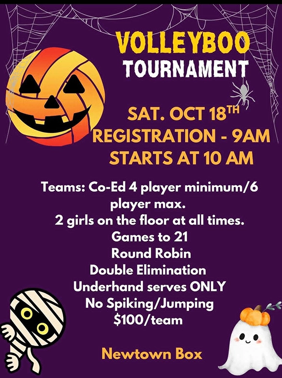 - Volleyboo Tournament at Newtown Box: Saturday, October 18th, Registration at 9am, Tourney starts at 10am