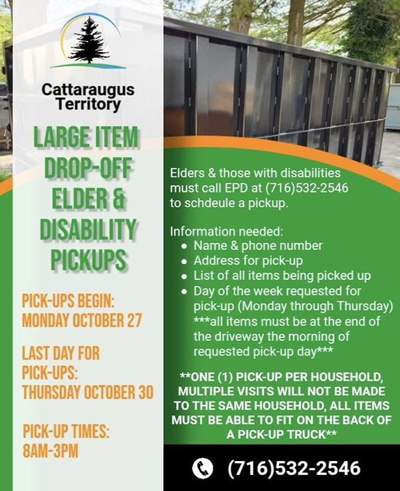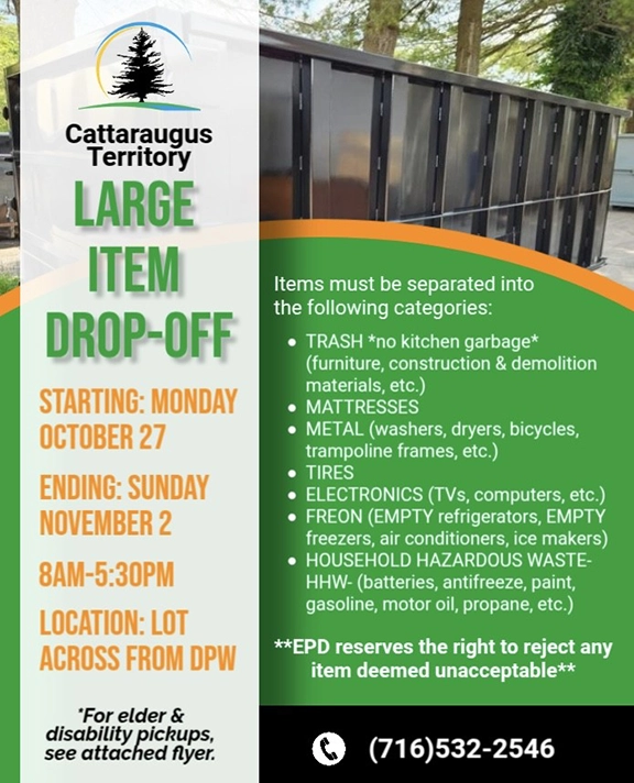The Seneca Nation Environmental Protection Department (EPD), Cattaraugus Territory, is hosting their annual Large Item Drop-off event the week of Monday, October 27th – Sunday, November 2nd, 2025. Please drop-off your items between the hours of 8am-5:30pm at the lot across from DPW. Elder and Disability pick-ups will be held Monday, October 27th thru Thursday, October 30th. Pick-up times will be held 8am-3pm.