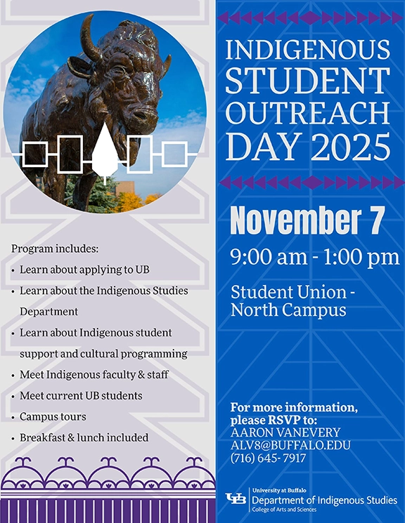 Mark your calendars. The Department of Indigenous Studies at the University at Buffalo will be having their Indigenous Student Outreach Day on Friday, November 7, 2025. For current high school students interested in attending UB!