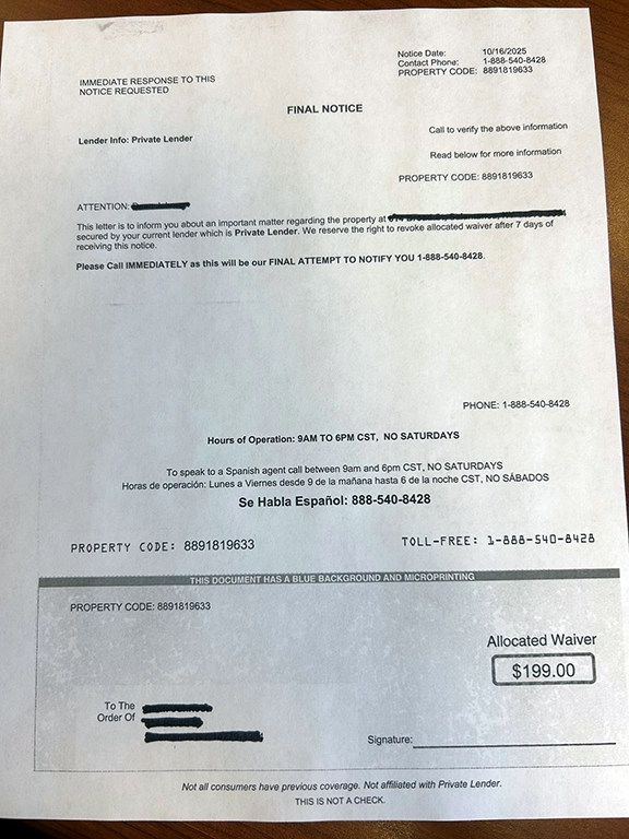 The Treasurer’s Office wishes to remind you to be on HIGH Alert when it comes to personal identity information. Recently, a scam targeting property owners has reached some of our community Elders. The scam comes in the form of a mailer with a check attached and involves individuals posing as private lenders who claim they must speak with the property owner immediately. They further state that they reserve the right to revoke an allocated waiver after 7 days of receiving the notice, creating a false sense of urgency. Please be advised that this communication is fraudulent and that legitimate agencies will never demand immediate action or personal information in this manner.