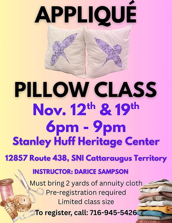 - Applique Pillow Class w/Darice Sampson: Wednesday, November 12th & 19th from 6-9pm