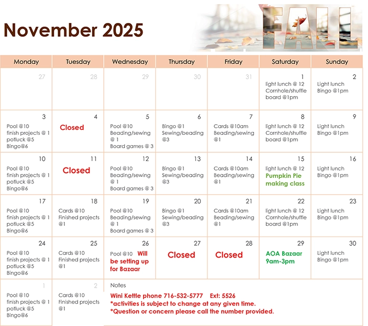 Stop down to the Allegany Senior Center or the Wini Kettle Senior Center and enjoy daily activities throughout the month of November. For more information call Stephanie John at (716) 945-8990 (for Allegany) OR Brittany Seneca at (716) 532-5777, ext. 5501 for Cattaraugus.