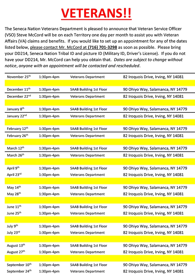 The Seneca Nation Veterans Department is pleased to announce that Veteran Service Officer (VSO) Steve McCord will be on each Territory one day per month to assist you with Veteran Affairs (VA) claims and benefits. If you would like to set up an appointment for any of the dates listed below, please contact Mr. McCord at (716) 701-3298 as soon as possible. Please bring your DD214, Seneca Nation Tribal ID and picture ID (Military ID, Driver’s License). If you do not have your DD214, Mr. McCord can help you obtain that. Dates are subject to change without notice, anyone with an appointment will be contacted and rescheduled.