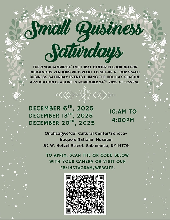 **CALLING ALL INDIGENOUS VENDORS** The Onöhsagwë’de’ Cultural Center/Seneca-Iroquois National Museum is holding Small Business Saturdays during the month of December. If you are looking to set up at this event, please use the link provided or scan the QR Code to submit your application. Don’t miss out on this opportunity! Shop small businesses this holiday season! https://form.jotform.com/…/small-business-saturdays-2025.