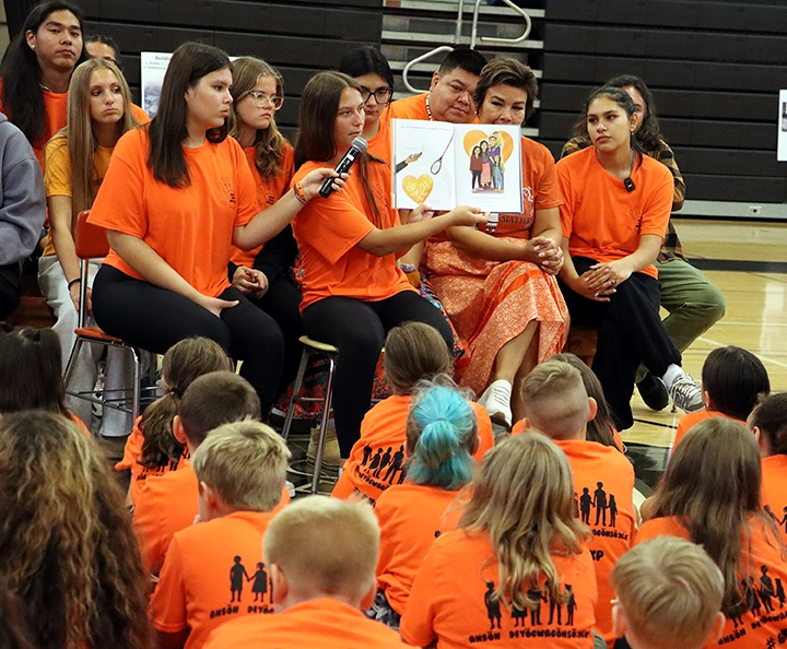 Students of all ages filled the school’s gym, wearing orange shirts designed by Gates and provided by the Seneca Nation as part of the “Every Child Matters” campaign. There were several presentations throughout the day, with each tailored to the age group in the gym at the time.