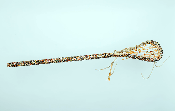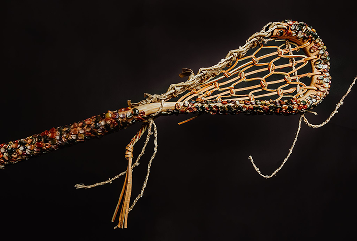Hand set, kernel by kernel, woven with cornhusk braid into the sidewall and bridges/runners this steam bent hand carved hickory #Lacrosse stick represents the many onëö (corn) stories from Indigenous Peoples worldwide.