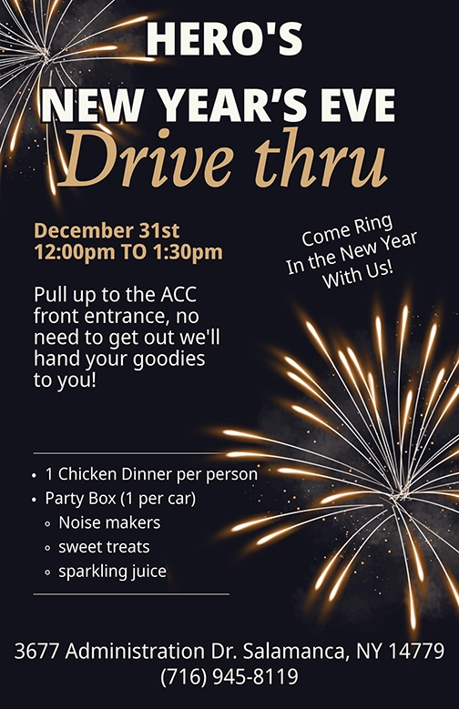 Mark your calendars: HERO’s New Year’s s Eve chicken dinner drive through, December 31st starting at 12:00pm till 1:30pm or until gone! Plus a party box to help ring in the new year! See flyer below for details.