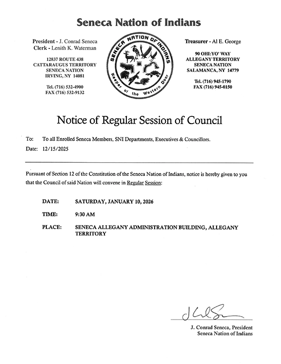 Pursuant of Section 12 of the Constitution of the Seneca Nation of Indians, notice is hereby given to you that the Council of said Nation will convene in Regular Session:
