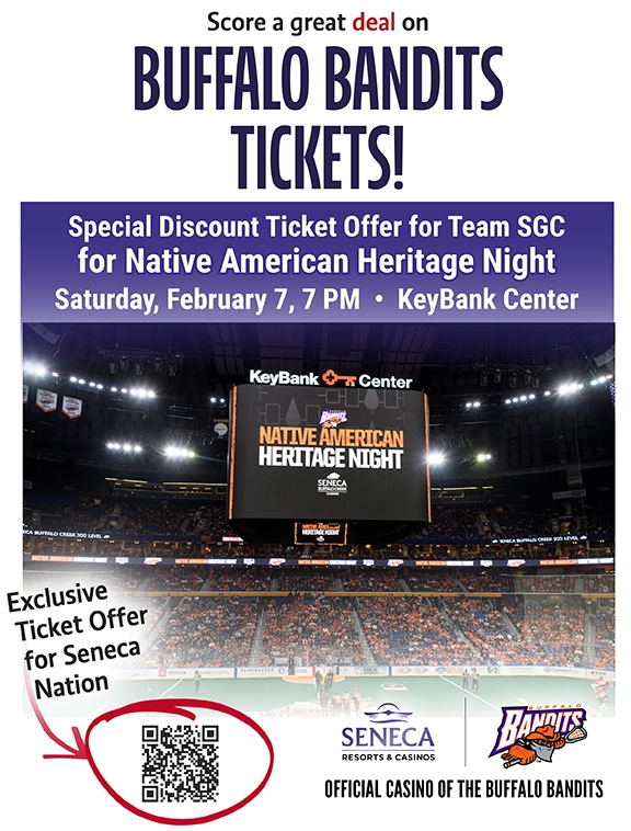 A special discount ticket offer for Team SGC and Seneca Nation members for the Native American Heritage Night game happening Saturday, February 7th at 7pm are available HERE.