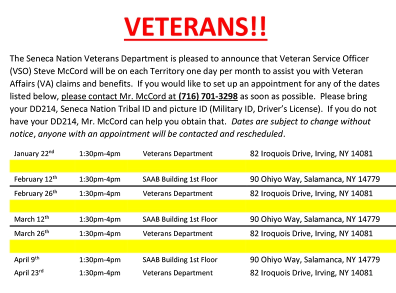 The Seneca Nation Veterans Department is pleased to announce that Veteran Service Officer (VSO) Steve McCord will be on each Territory one day per month to assist you with Veteran Affairs (VA) claims and benefits. If you would like to set up an appointment for any of the dates listed below, please contact Mr. McCord at (716) 701-3298 as soon as possible. Please bring your DD214, Seneca Nation Tribal ID and picture ID (Military ID, Driver’s License). If you do not have your DD214, Mr. McCord can help you obtain that. Dates are subject to change without notice, anyone with an appointment will be contacted and rescheduled.