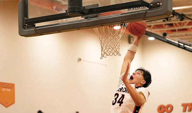 He catches passes in traffic outside the foul line and finds teammates along the baseline or open from the three-point arc. It allows Akron to play a lethal inside-out offense that is a nightmare for opposing high school defense to stop.