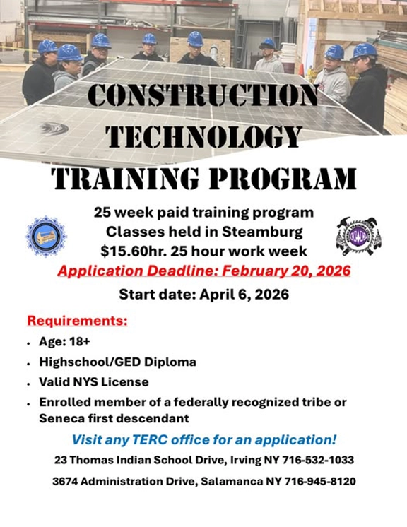 Applications are being accepted for the next 25 week paid training program! Stop into Cattaraugus or Allegany TERC office for an application. Cattaraugus Office: 716-532-1033, Salamanca Office: 716-945-8120. Call with any questions.