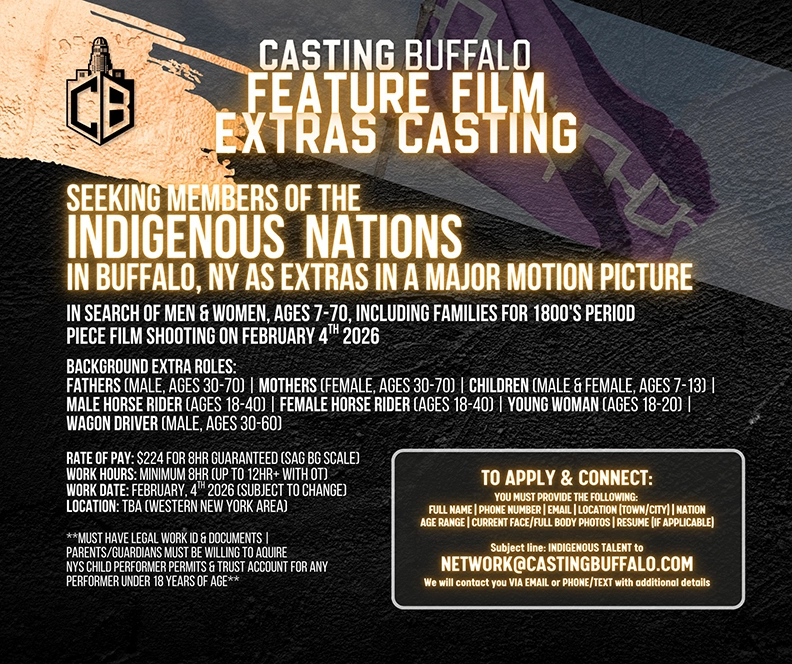 Casting Buffalo is seeking members of Indigenous Nations in the WNY area for extras in a feature film. See flyer below for complete details. For any questions, and to apply, please email: network@castingbuffalo.com with subject line: Indigenous Talent.