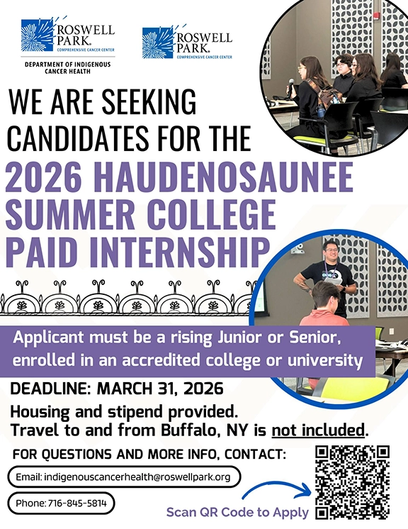 The Department of Indigenous Cancer Health is seeking candidates for the 2026 Haudenosaunee Summer College Paid Internship at Roswell Park Comprehensive Cancer Center!