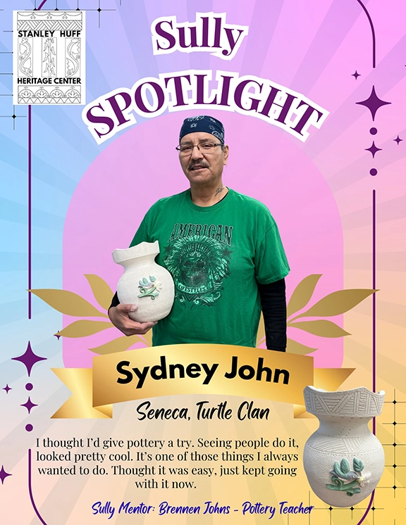 Next in our Sully Spotlight is Syd John. Syd is an example of someone taking an interest in our cultural arts classes here. He is a member of the Catt Rez Beaders, frequently works in the carving and pottery studio and has even started teaching his own carving classes. His creativity shines through all that he does.