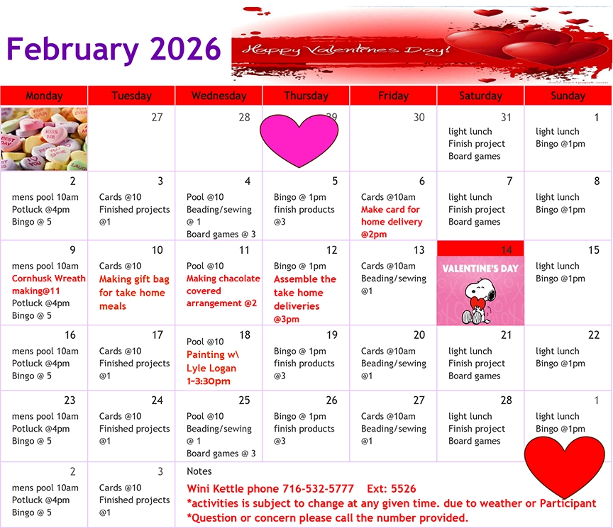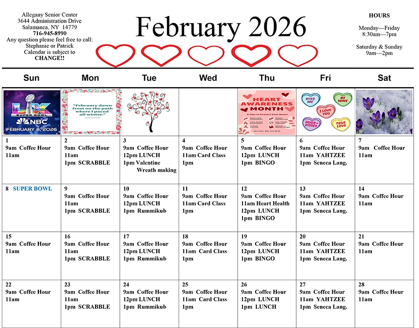 Stop down to the Allegany Senior Center or the Wini Kettle Senior Center and enjoy daily activities throughout the month of February. For more information call Stephanie John at (716) 945-8990 (for Allegany) OR Adrian Carry-Moccasin at (716) 532-5777, ext. 5501 for Cattaraugus.