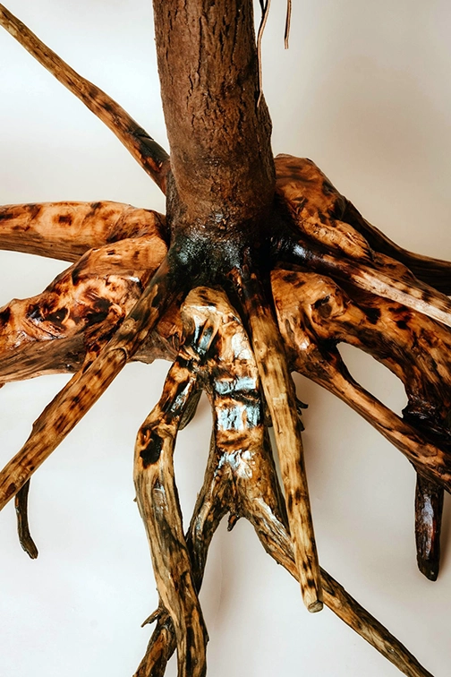 The fire marks truth. It does not erase it. From that burning rises the top of the tree—steam-bent, carved, and shaped upward—representing new growth, resistance, resilience, and the enduring strength of the people. Hickory was hand-dug and collected from Quaker Bridge Area-Low Banks-on the Allegany Territory, where Dr. Rodney C. Haring’s family once lived.