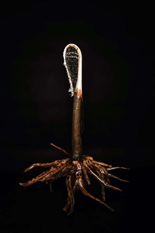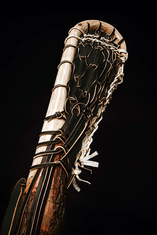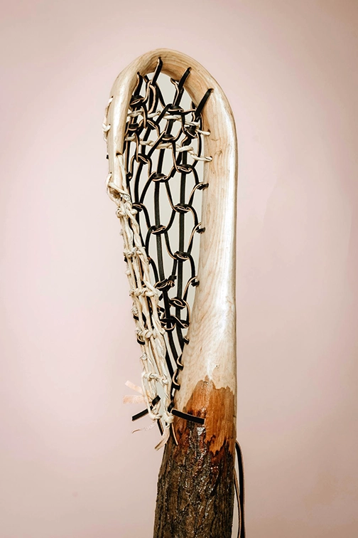 The piece was designed, steamed, carved, and chiseled by Dr. Haring (Onödowáʼga:’), carrying family memory into form. His nephew, Brody D. Jimerson (Onödowáʼga:’) wove the piece with full leather and bear rawhide, honoring connection to the Bear Clan—medicine, healing, and the strength of the bear that protects the people. The base is White Pine from the Cattaraugus Territory, Seneca Nation. Representing the Tree of Peace—foundational knowledge, wisdom, and strength within the Haudenosaunee Confederacy. Two territories. One people. Connected across lands and generations. Lacrosse is medicine.
