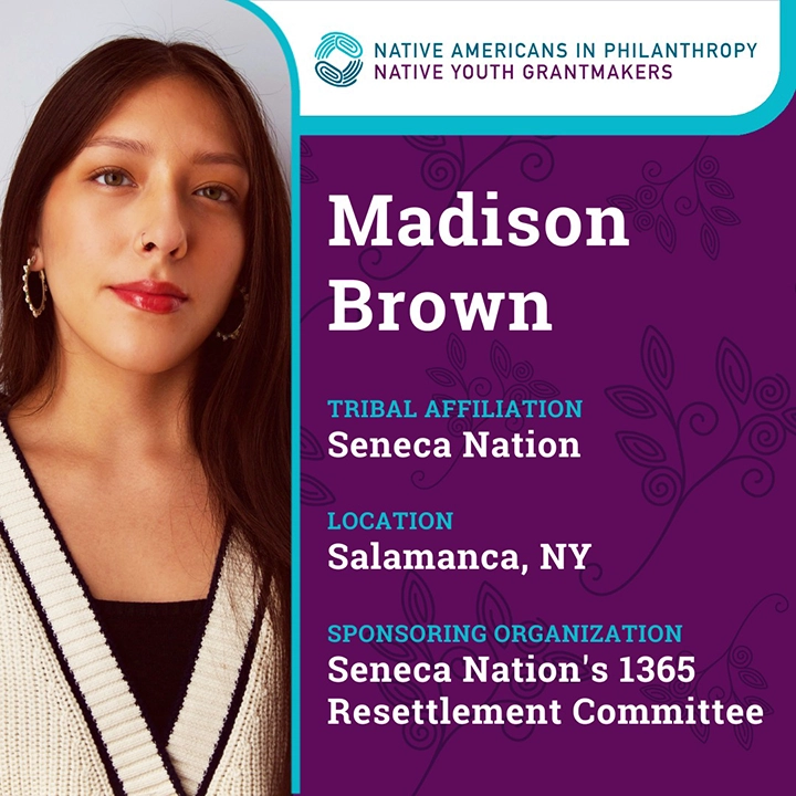 Madison Brown, A:ya’gah’ganö:s’ (she has beautiful eyes), Onöndowa’ga:’, is an enrolled member of the Seneca Nation, from the Allegany Territory. Madison is deeply rooted in leadership and advocacy, particularly within Indigenous youth organizations and community development initiatives.