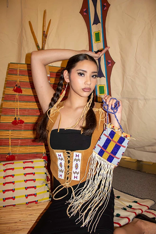 Charlie modeled multiple looks from various designers including Tisha Thompson Designs, Randi Nelson Designs, K. Francis Brand, Chelsea Nokusis, and Bobby Qalutaksraq.