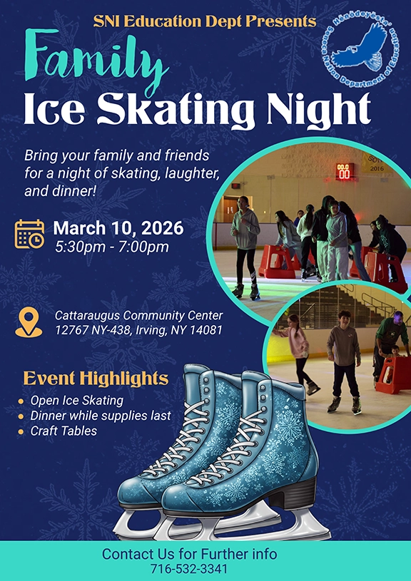 Bring your family and friends for a night of skating, laughter, and dinner on March 10, 2026 from 5:30pm-7pm at the Cattaraugus Community Center!