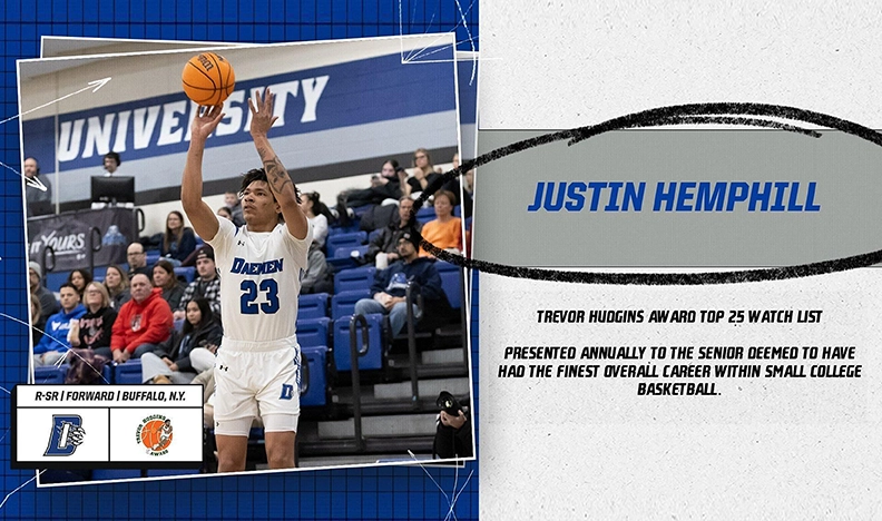 AMHERST, N.Y. – Daemen University redshirt senior forward Justin Hemphill (Buffalo, N.Y.) has been named to the 2026 Trevor Hudgins Award Top 25 Watch List, announced today by Small College Basketball (SCB), a national organization that spotlights the achievements of a non-NCAA Division I men’s basketball teams and student-athletes. Since 2024, the Trevor Hudgins Award has been presented annually to the senior men’s basketball player with the best overall career within SCB.