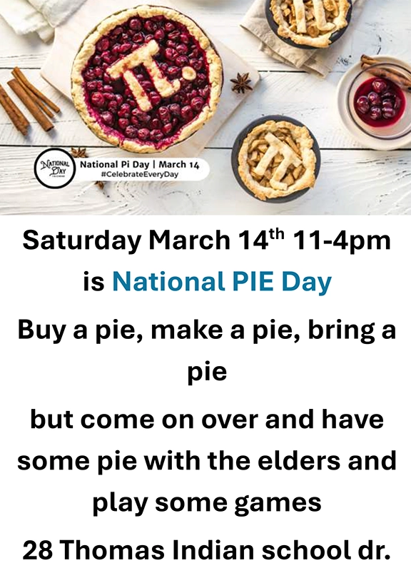 Saturday, March 14th is National PIE Day. Buy a pie, or make a pie! Bring it over to the Wini Kettle Senior Center from 11am-4pm, and come on over and have some pie with the elders and play some games!