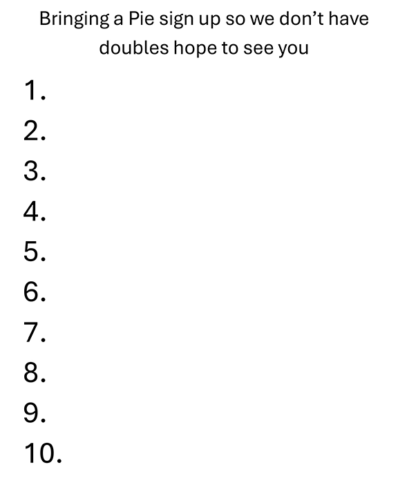 Bringing a Pie sign-up so we don’t have doubles – see form below. We hope to see you!