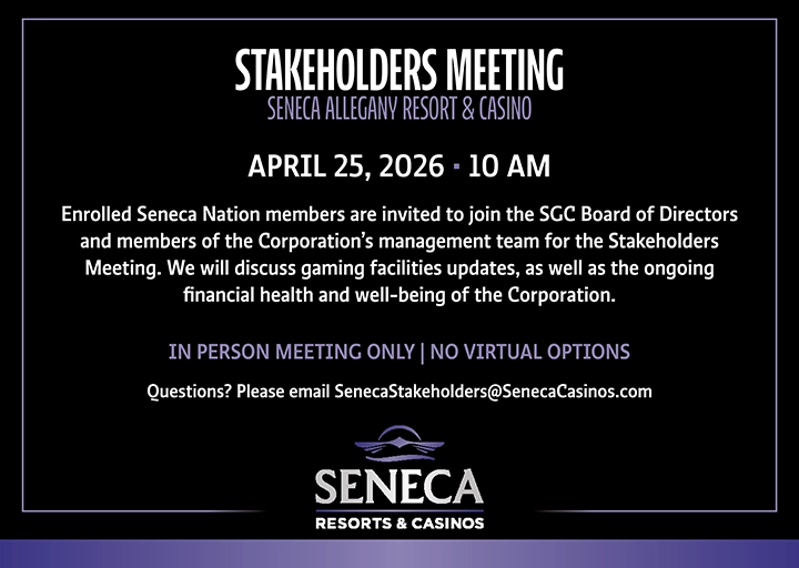Enrolled Seneca Nation members are invited to join the SGC Board of Directors and members of the Corporation’s management team for the Stakeholders Meeting. We will discuss the ongoing financial health and well-being of the Corporation.