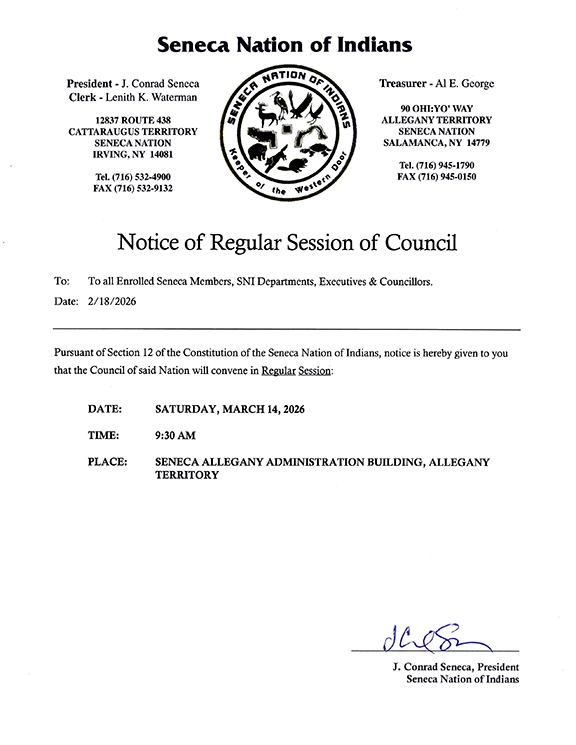 Pursuant of Section 12 of the Constitution of the Seneca Nation of Indians, notice is hereby given to you that the Council of said Nation will convene in Regular Session: