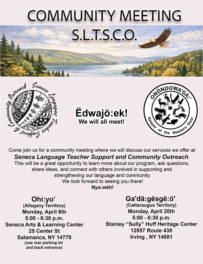 Come join us for a community meeting where we will discuss our services we offer at Seneca Language Teacher Support and Community Outreach. This will be a great opportunity to learn more about our program, ask questions, share ideas, and connect with others involved in supporting and strengthening our language and community.
