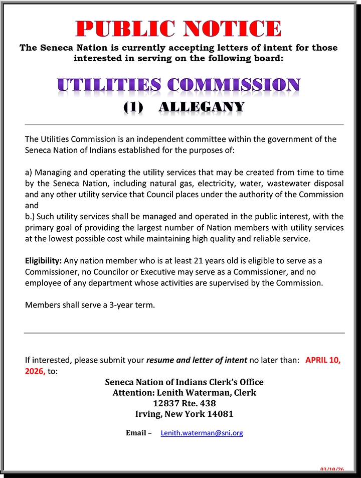 The Seneca Nation is currently accepting letters of intent for those interested in serving on the following board: