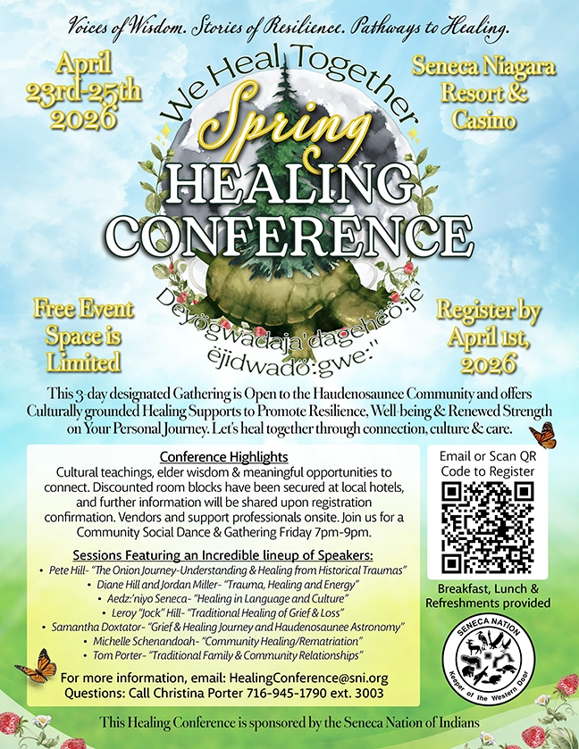 This 3-day designated Gathering will be held April 23rd-25th, 2026 at the Seneca Niagara Resort & Casino, is open to the Haudenosaunee Community and offers culturally grounded healing supports to promote resilience, well-being & renewed strength on your personal journey. Let’s heal together through connection, culture & care.