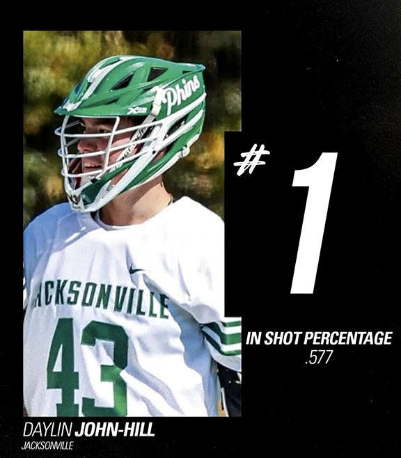 Ja:göh Hodihëhdö (Daylin) John-Hill, Tuscarora/Onöndowa’ga, Hogë’ge:ga:’, who is currently #1 with the Jacksonville Dolphins Men’s Lacrosse team for his In Shot Percentage of 0577.