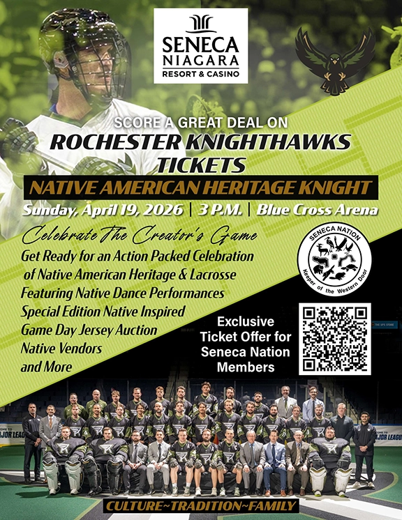 Native American Heritage Knight with the Rochester Knighthawks is flying in just around the corner. Join us on April 19th for an action-packed celebration of culture, tradition, and lacrosse at Blue Cross Arena! Enjoy Native dance performances, Special Edition jersey auctions, a new team giveaway and so much more. We’ll see you there!