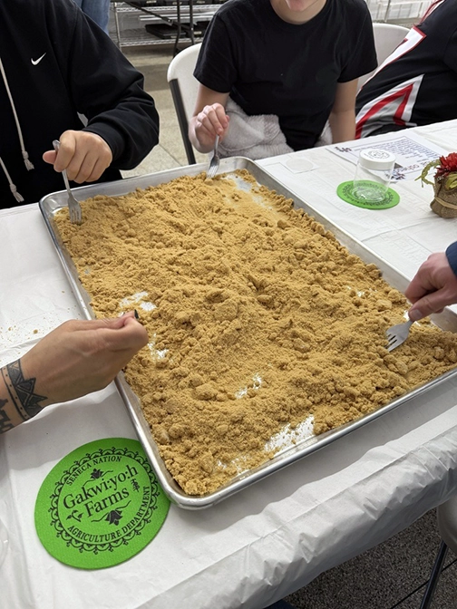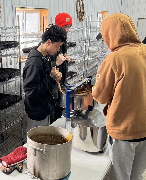 On March 18, 2026, some of our 8th and 9th grade Seneca Language students took a trip to Gakwi:yo:h Farms. The students have learned maple tapping here on campus, but they were able to see a boiler, learn more about the boiling process, ask questions, speak in Seneca, watch syrup turn into maple sugar in real time, sift and bottle their own maple sugar, and eat a delicious breakfast using syrup from the trees at the farm! We learned a lot about the farm and what it offers, as well as projects they are working on. This trip was possible thanks to the OBEWL language grant through NYS.