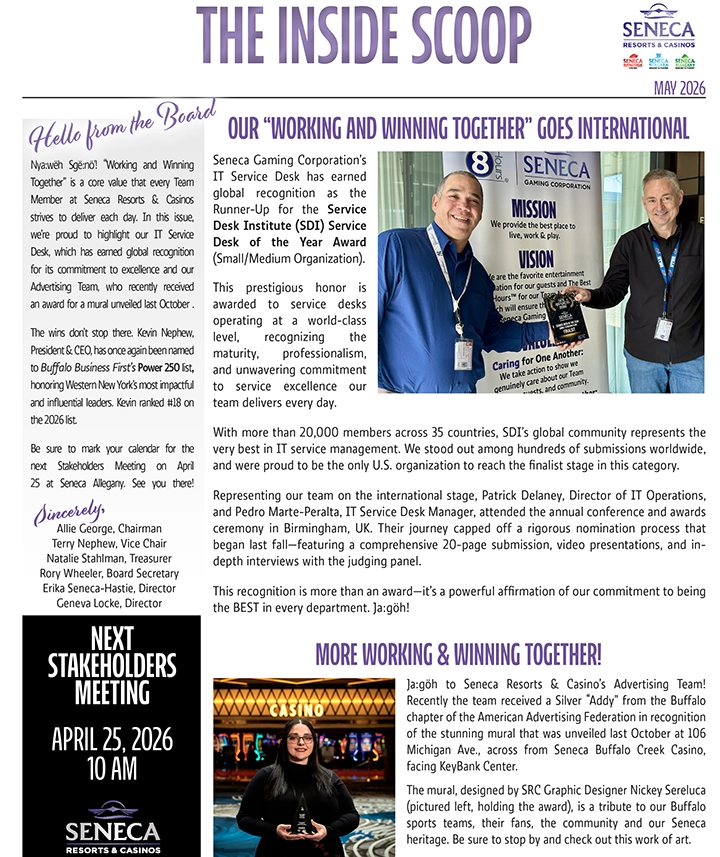Below you’ll find the latest Seneca Gaming Corporation news and updates for May 2026 provided by the Seneca Gaming Corporation.